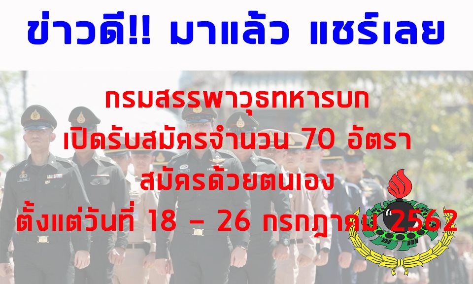 กรมสรรพาวุธทหารบก เปิดรับสมัครสอบเป็นพนักงานราชการ จำนวน 70 อัตรา สมัครด้วยตนเอง ตั้งแต่วันที่ 18 - 26 กรกฎาคม 2562ประกาศกรมสรรพาวุธทหารบก เรื่อง การสรรหาและเลือกสรรบุคคลเพื่อจ้างเป็นพนักงานราชการ ประจำปีงบประมาณ 2562กรมสรรพาวุธทหารบก มีความประสงค์จะรับสมัครบุคคลเพื่อจ้างเป็นพนักงานราชการ ประจำปีงบประมาณ 2562 จำนวน 70 อัตรา โดยมีรายละเอียดการรับสมัคร ดังนี้ตำแหน่งที่เปิดรับสมัครสอบ1. ช่างโยธา จำนวน 1 อัตรา (ชาย/หญิง) 2. ช่างยางและพลาสติก จำนวน 3 อัตรา (ชาย)3. ช่างสรรพาวุธ จำนวน 66 อัตรา (ชาย/หญิง)การรับสมัครสอบผู้ที่มีความประสงค์จะสมัครสอบ สมัครด้วยตนเองได้ที่ แหล่งสมาคม กรมสรรพาวุธทหารบก ถนนทหาร แขวงถนนนครไชยศรี เขตดุสิต กรุงเทพมหานคร ตั้งแต่วันที่ 18 - 26 กรกฎาคม 2562 เว้นวันหยุดราชการรายละเอียดเพิ่มเติม- ไฟล์ประกาศรับสมัครสอบ